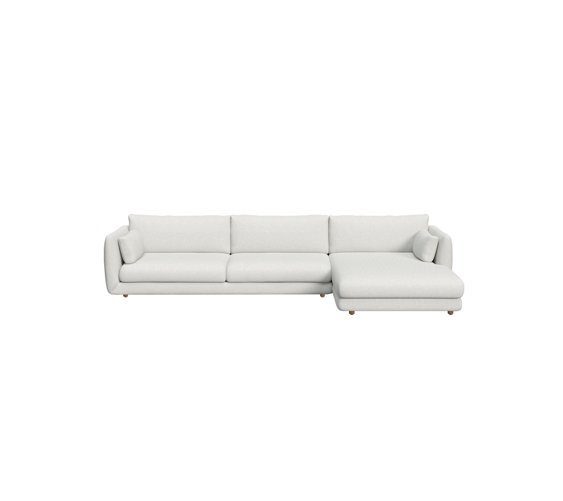 The Bloom 3-seater with left-hand chaise longue by Cane-line Design is a statement piece enriched by the warmth of teak. The sculpted silhouette is set on elegant teak legs, bringing height and visual lightness to the design. The chaise longue provides generous room for unwinding in style, while the deep cushions and refined upholstery offers everyday luxury with a classic appeal. The chaise longue sofa is also available as a [right-hand version with teak legs](/products/Bloom 3-seater sofa with chaise longue, right and teak legs) or with a plinth base for a grounded aesthetic.